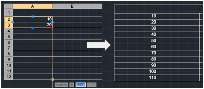 CADian 2026 lần đầu tiên hỗ trợ Autofill cho Table, giúp kéo – thả để tự động mở rộng chuỗi dữ liệu, lặp mẫu hoặc đánh số liên tục.